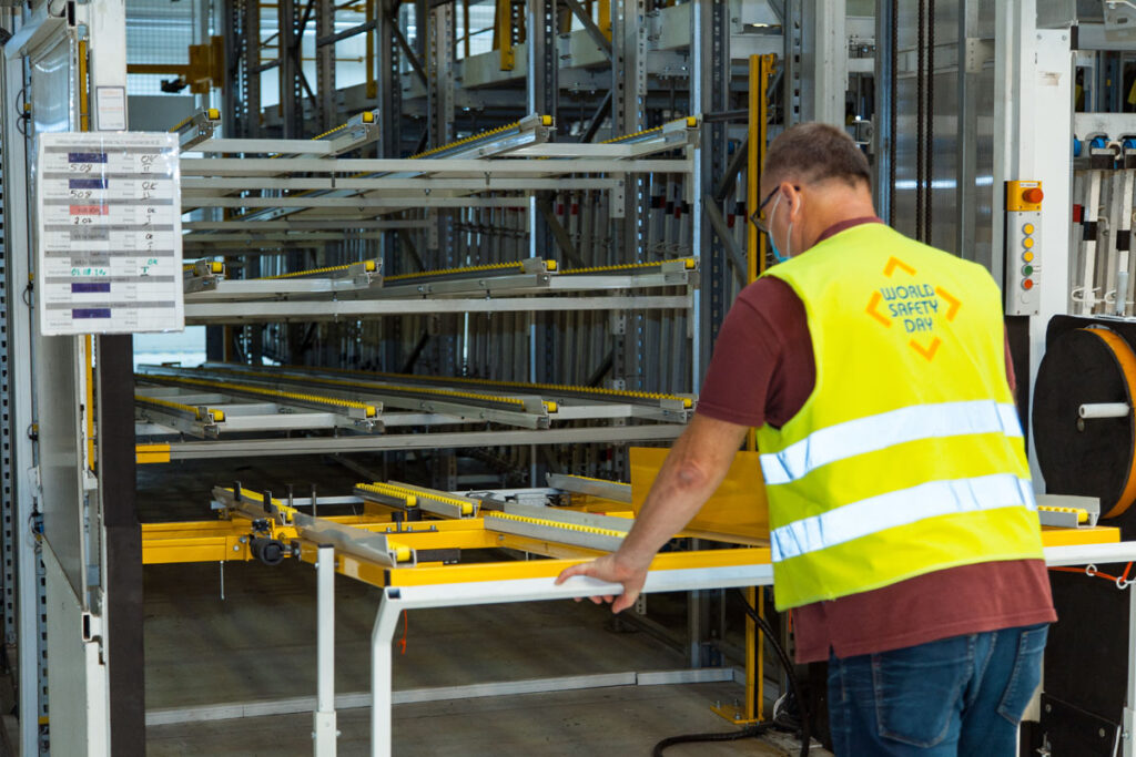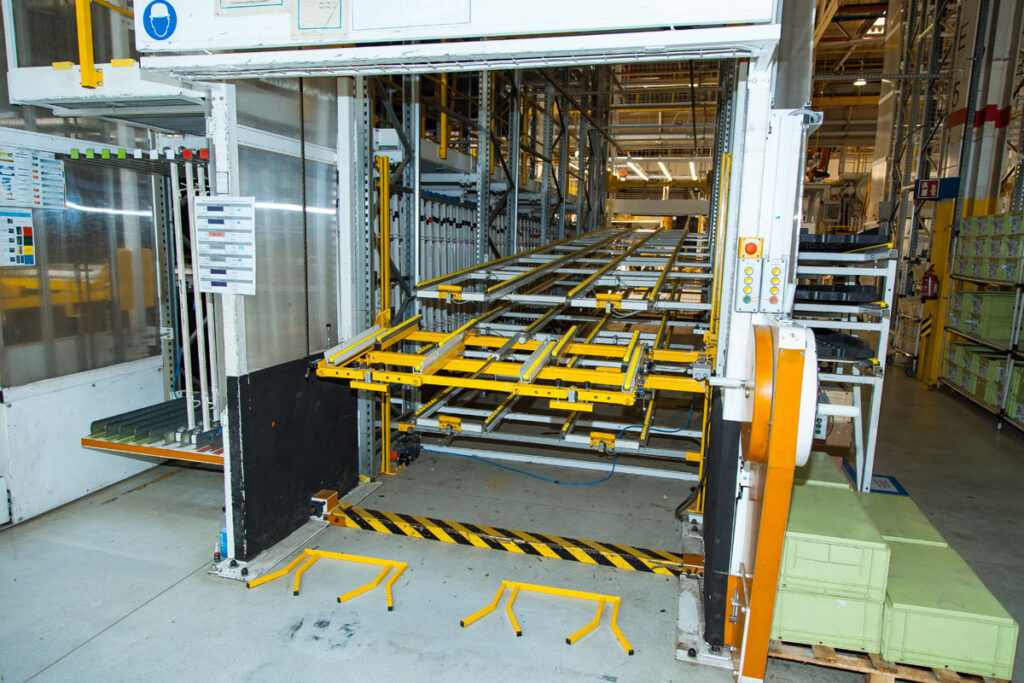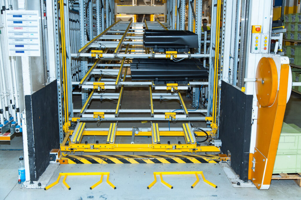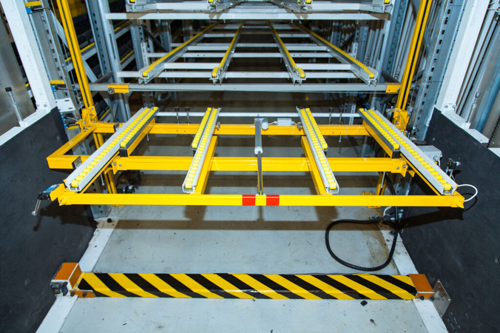 Składowany towar, zostaje umieszczony na odpowiednim poziomie regału za pośrednictwem automatycznej windy. W ten sam sposób następuje odbiór towaru z regału.